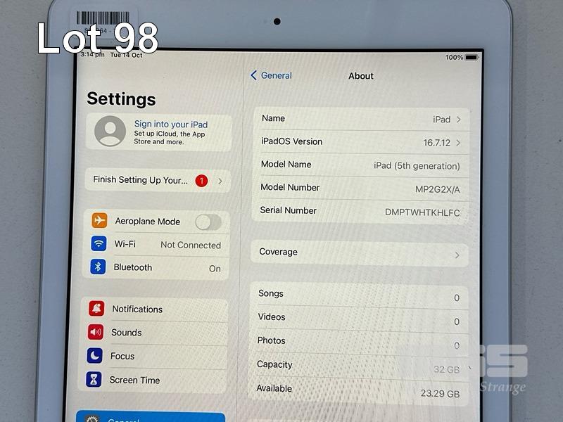 APPLE iPAD 5TH GEN, 32GB, Wi-Fi, SILVER, MODEL MP2G2X/A, A1822 (NO CABLE, NO CHARGER) S/N:DMPTWHTKHLFC