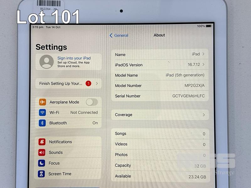 APPLE iPAD 5TH GEN, 32GB, Wi-Fi, SILVER, MODEL MP2G2X/A, A1822 (NO CABLE, NO CHARGER) S/N:GCTVGEM6HLFC