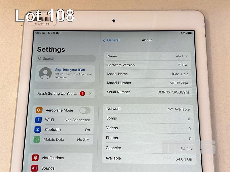 APPLE iPAD AIR 2, 64GB, Wi-Fi, CELLULAR, SILVER, MODEL MGHY2X/A, A1567 (NO CABLE, NO CHARGER) (NOTE: MINOR SCRATCHES ON SCREEN) S/N:DMPNXYJWG5YM