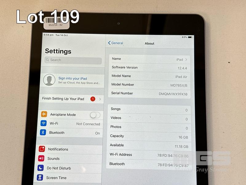 APPLE iPAD AIR, 16GB, Wi-Fi, SPACE GREY, MODEL MD785X/B, A1474 (NO CABLE, NO CHARGER) (NOTE: MINOR SCRATCHES ON SCREEN) S/N:DMQMVWX9FK10