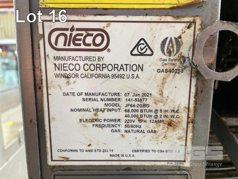CONVEYOR OVEN, NIECO MOD: JF64-2GBG S/NO: 141-53877 DOM: 2021 2 TIER, NATURAL GAS, 240V 15AMP PLUG