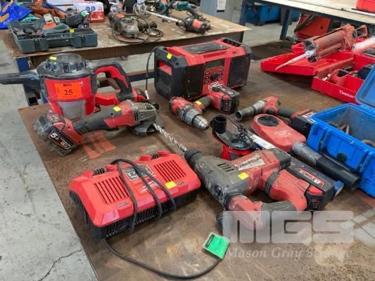 MILWAUKEE CORDLESS KIT INCLUDING VACUUM CLEANER, DRILL, IMPACT WRENCH, ANGLE GRINDER, IMPACT DRILL, CHARGER & 5 x BATTERIES