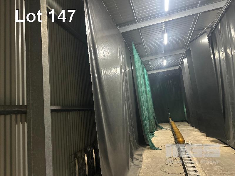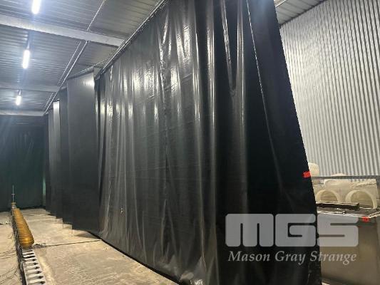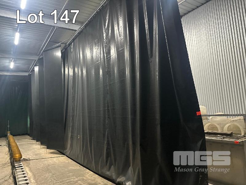 3 x POLY BACKED CURTAINS ON RAILS, UP TO 20m & 5 x CEILING MOUNT FIXED CURTAINS, 6m (H)