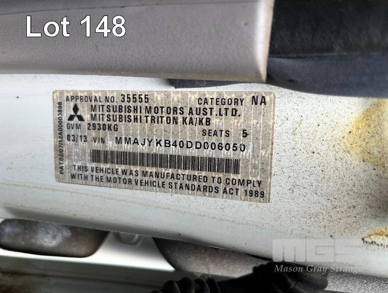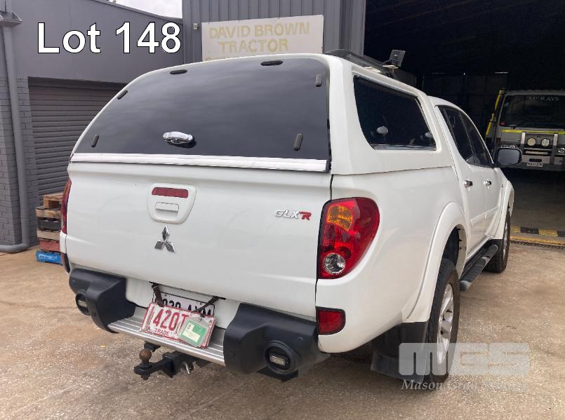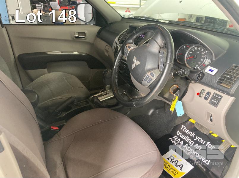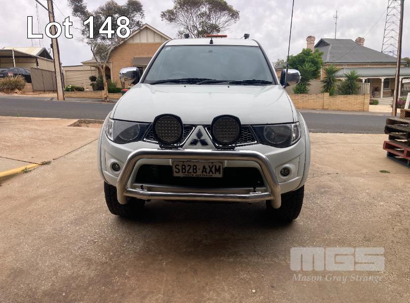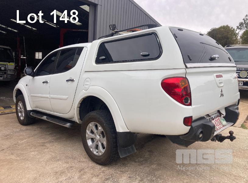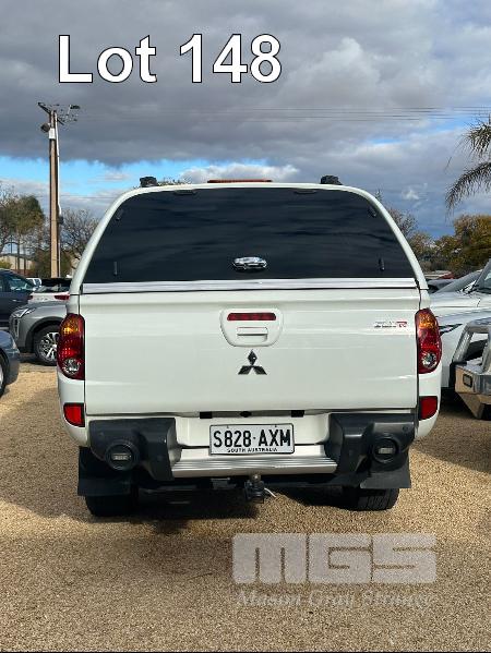 2013 MITSUBISHI TRITON GLX-R MNMY13 DUAL CAB UTILITY 4x4 REG: S828AXM VIN: MMAJYKB40DD006050 ODO: 179,341km 2.5 LITRE DTFI DT4 DIESEL TURBO, 5 SPEED AUTOMATIC TRANSMISSION, WHITE DUCO, 4 DOORS, 5 SEAT, 4x4 NUDGE BAR, SPOTLIGHTS, ALLOY WHEELS, SIDE STEPS, MITSUBISHI CANOPY