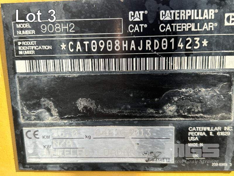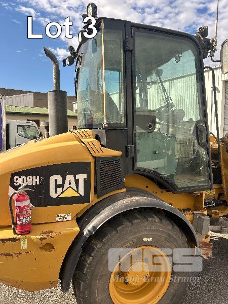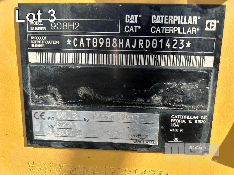 CATERPILLAR 908H2 WHEELED LOADER PIN: CAT0908HAJRD01423 HOURS: 9,358 SHOWING 4 CYLINDER TURBO DIESEL @55kw, ENGINE TYPE: C3.3B FITTED WITH GP BUCKET KEY #15 (WITH 1 KEY/S)