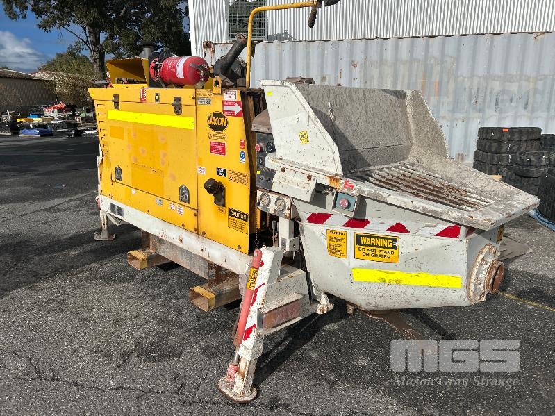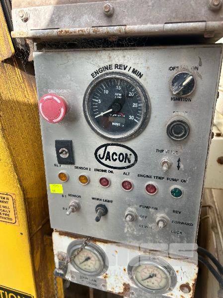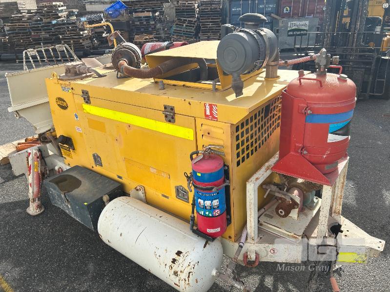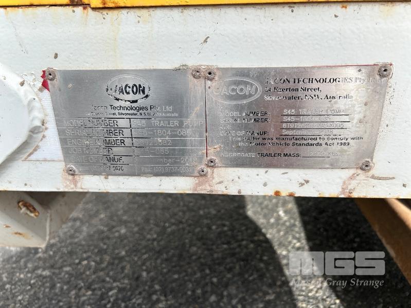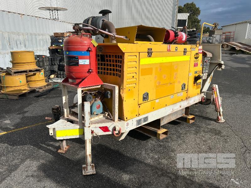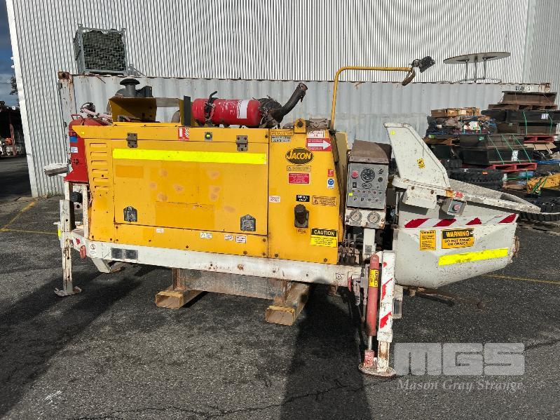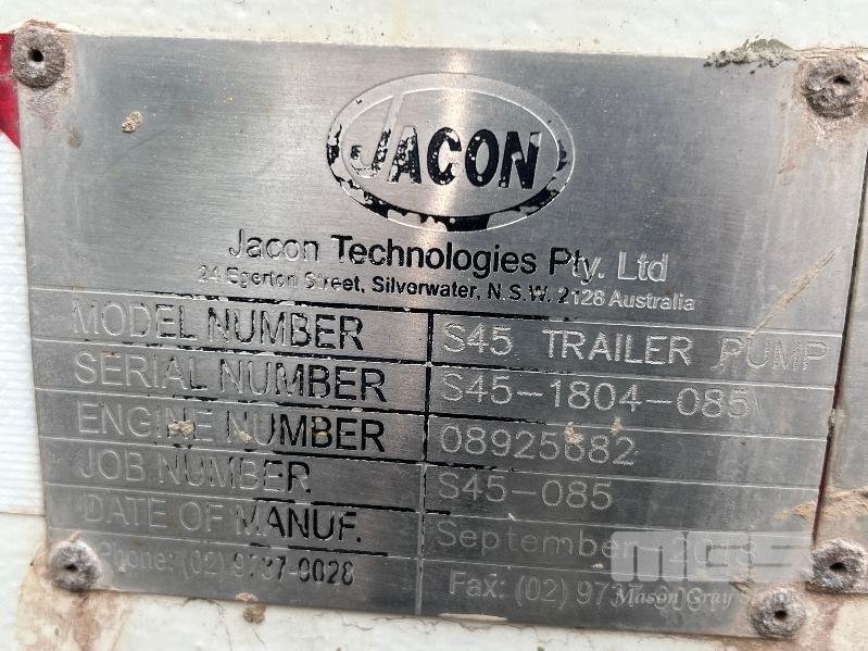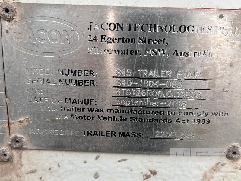 2018 JACON CONCRETE PUMP MODEL: S45 TRANSPORTABLE, SKID MOUNTED VIN NO: 6T9T26R06JOL1X005 POWERED BY DEUTZ MODEL: BF4L914 4 CYLINDER DIESEL ENGINE, 72.4 kw HRS SHOWING: 165 S VALUE TYPE CONCRETE PUMP, WITH MINE SPEC FIRE SUPRESSION SYSTEM, MAMMOTH ANTI SPARK EXAUST SYSTEM, SAWN AIR COMPRESSOR & AIR RECIVER TANK 2 x HYDRAULIC OUT RIGGERS BATTERY ISOLATION SWITCHES.