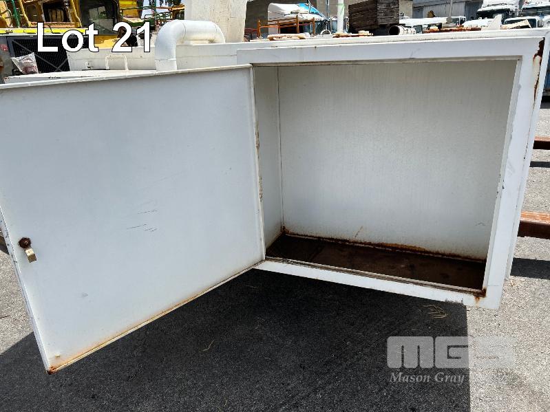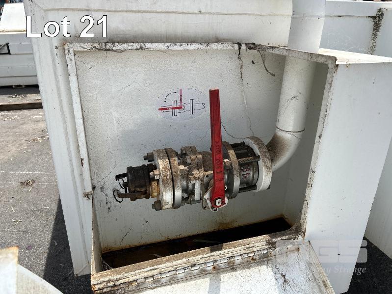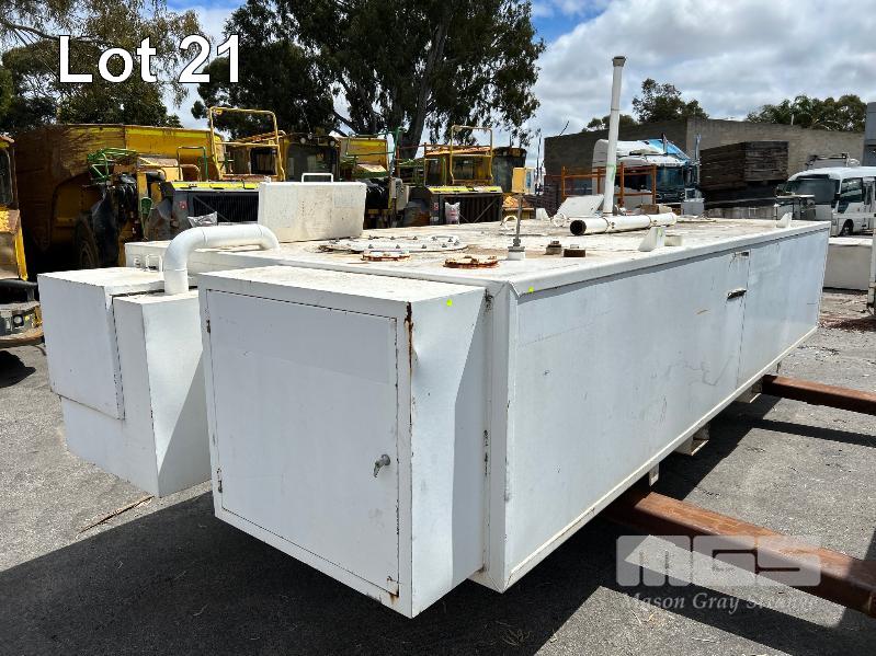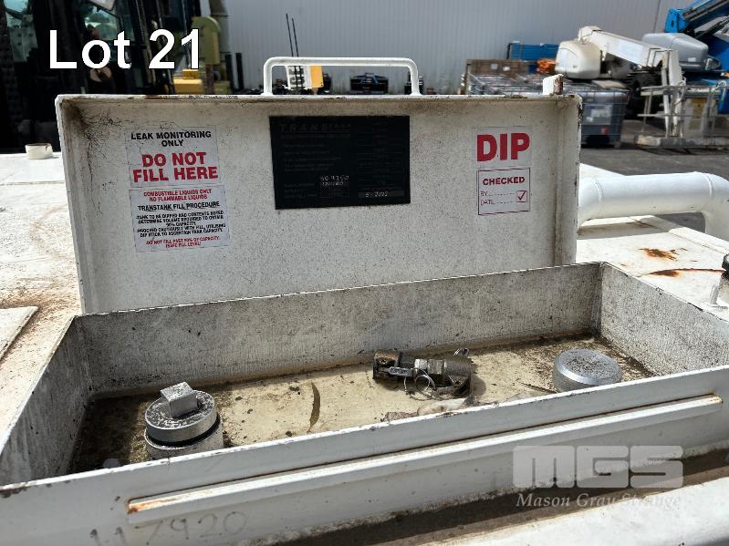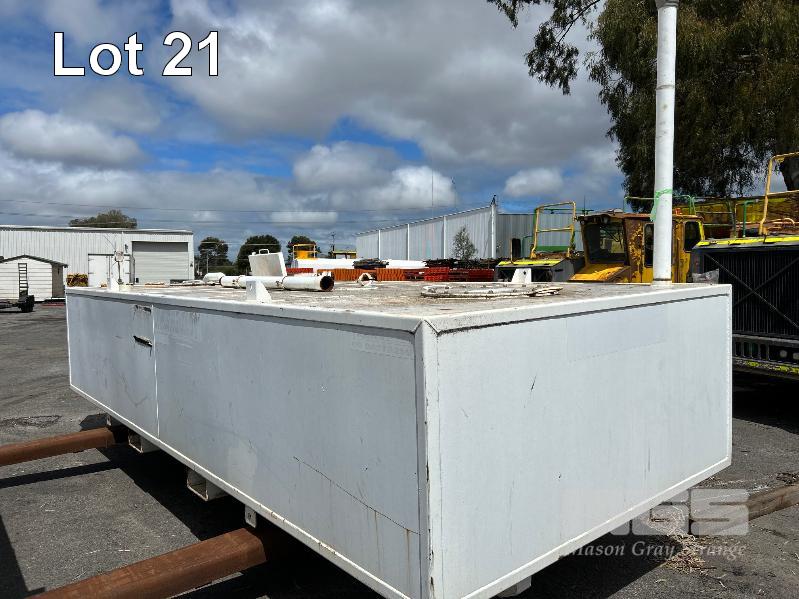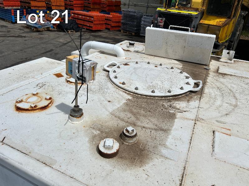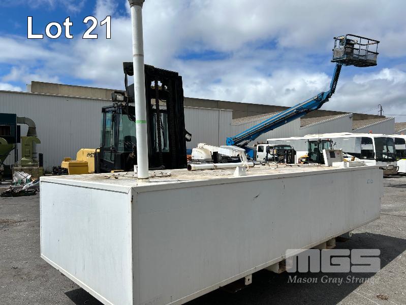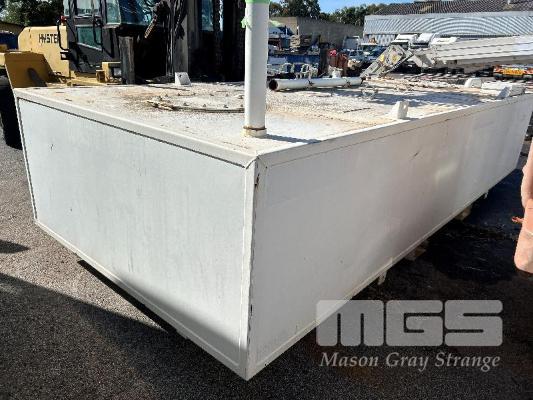 FUEL STORAGE TANK, TRANS TANK DOM: 2012 CAPACITY: 11,500 LITRE RECTANGLE STEEL CONSTRUCTION L: 5750mm, W: 2262mm, H: 1289mm WEIGHT: 4400kg EMPTY FITTED WITH FORK POCKETS & CORNER LIFTING LUGS