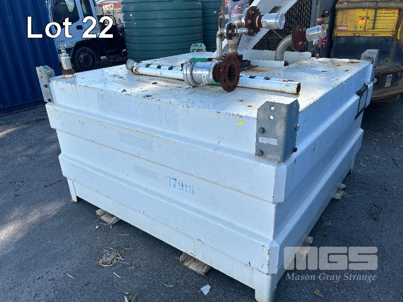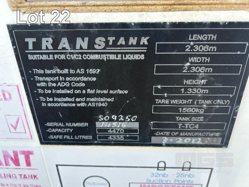 FUEL STORAGE TANK, TRANS TANK DOM: 2012 CAPACITY: 4470 LITRE SQUARE STEEL CONSTRUCTION L: 2306mm, W: 2306mm, H: 1330mm WEIGHT: 1560kg EMPTY FITTED WITH FORK POCKETS & CORNER LIFTING LUGS