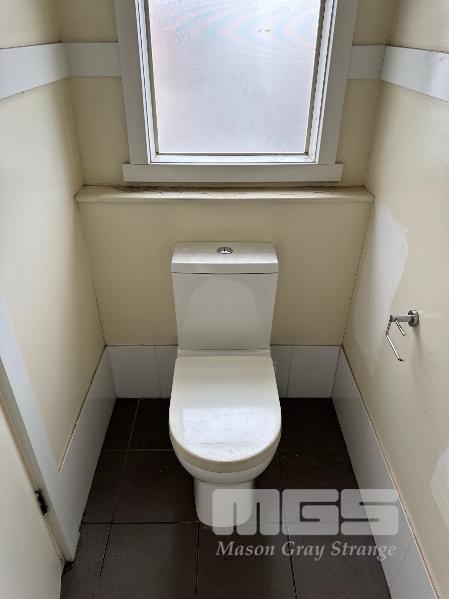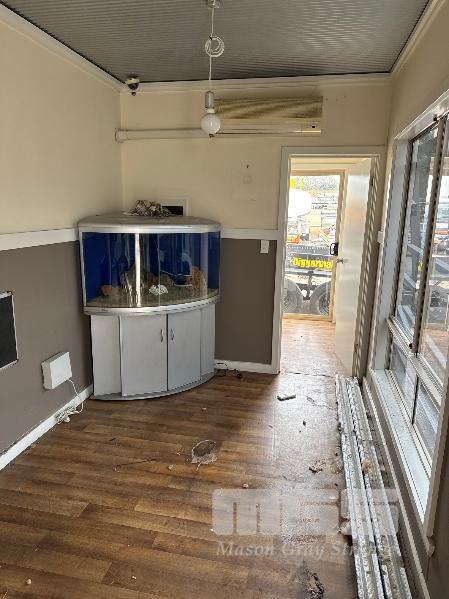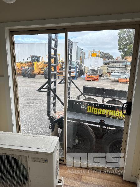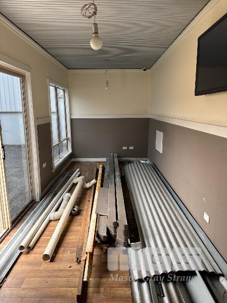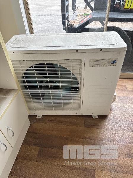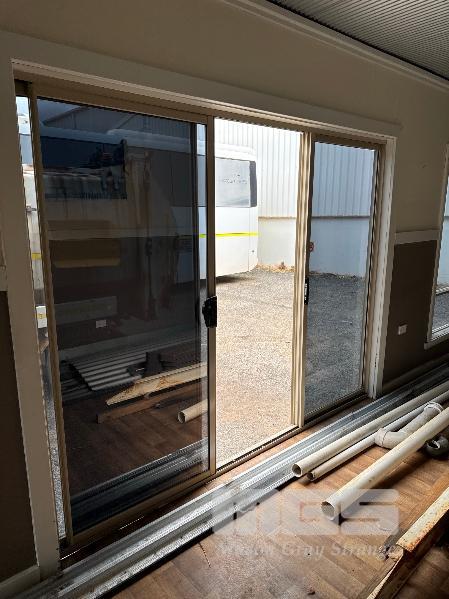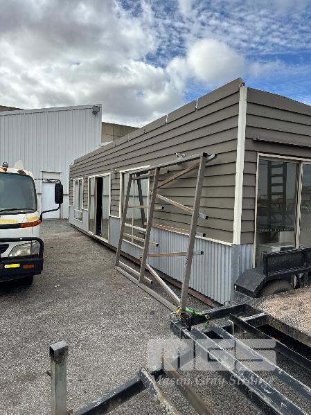 TRANSPORTABLE ACCOMODATION BUILDING, EXTERNAL: 12m x 2.6m MAIN LIVING AREA: 8700 x 2300 x 2600mm (H), KITCHEN: 2100 x 2300 x 2600mm (H), BATHROOM: 1000 x 2300 x 2600mm (H) 10 x 240V GPO'S, KITCHEN SINK & COUNTER, BATHROOM VANITY & TOILET, WITH LEAN TO ROOF, NOT ASSEMBLED & AC UNIT NOT INSTALLED 40ft SHIPPING CONTAINER BASE NOTE: HAS SOME LEAKS