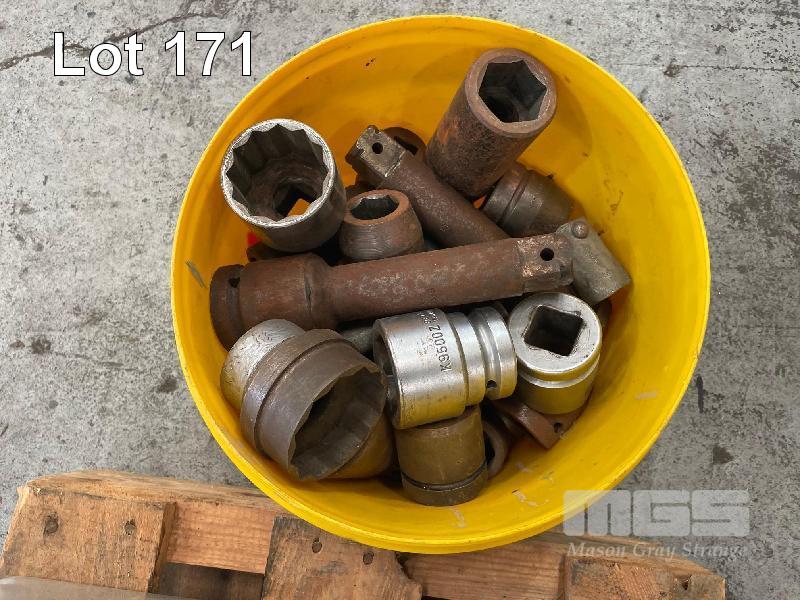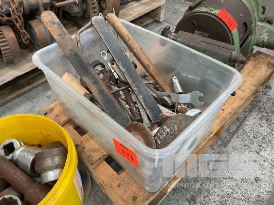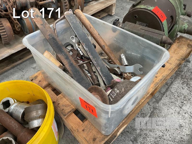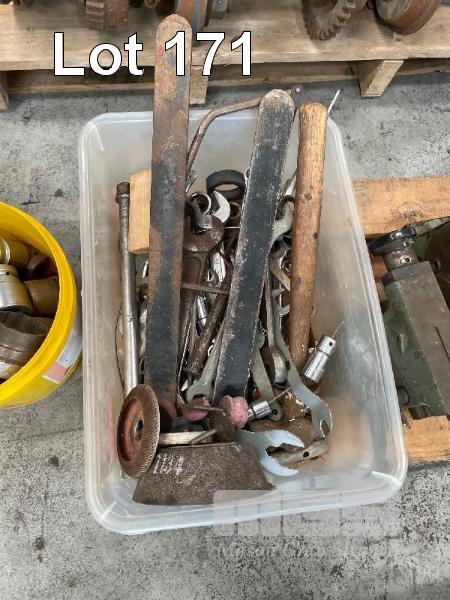 ASSORTED LARGE SOCKETS, 1 x TUB TOOLS, SPANNERS, ETC & TOOL BOX