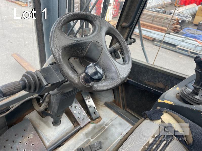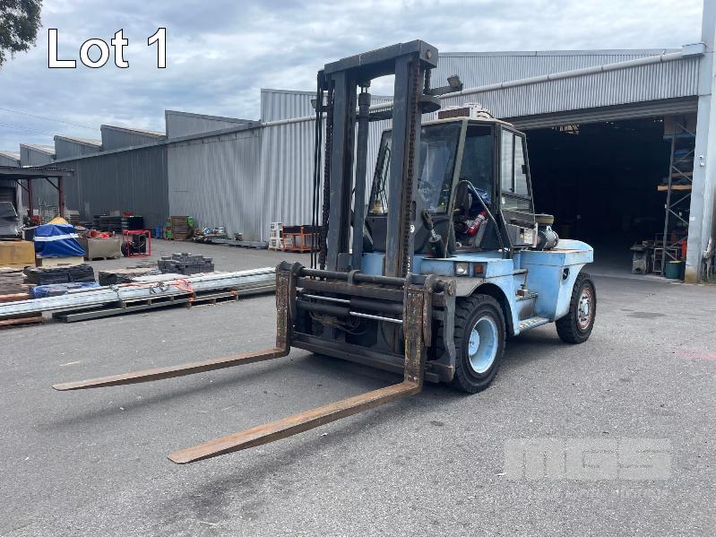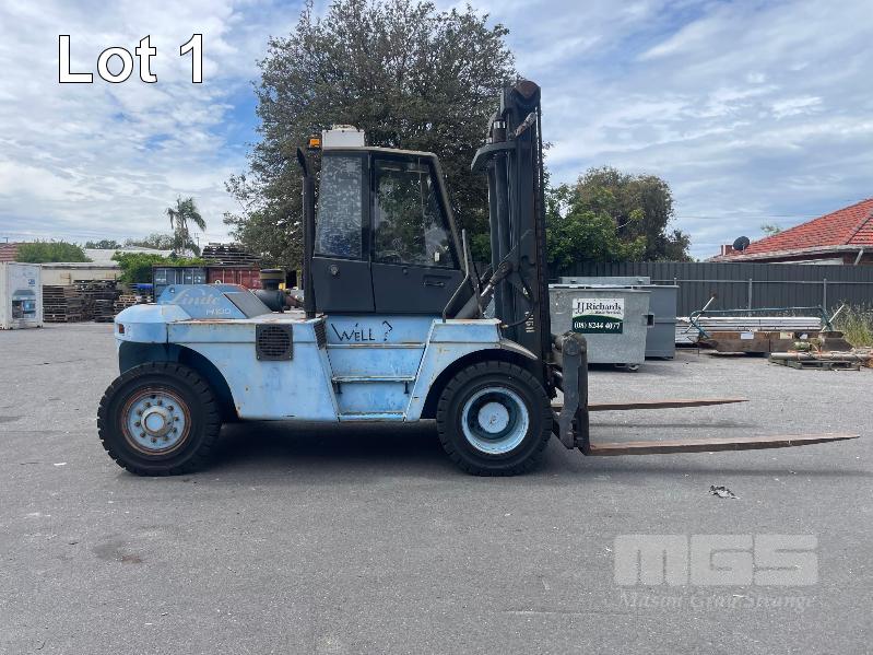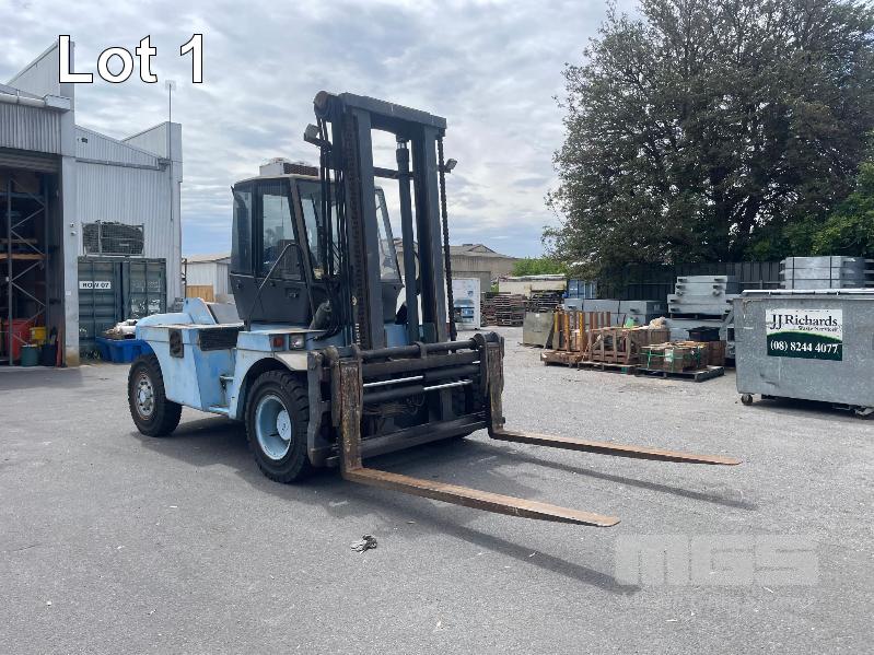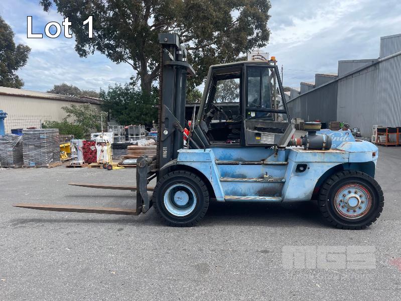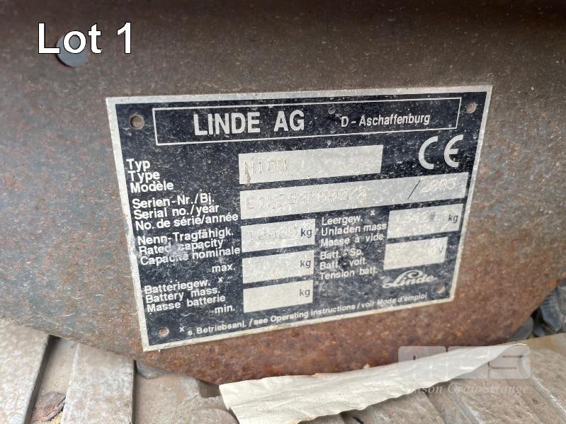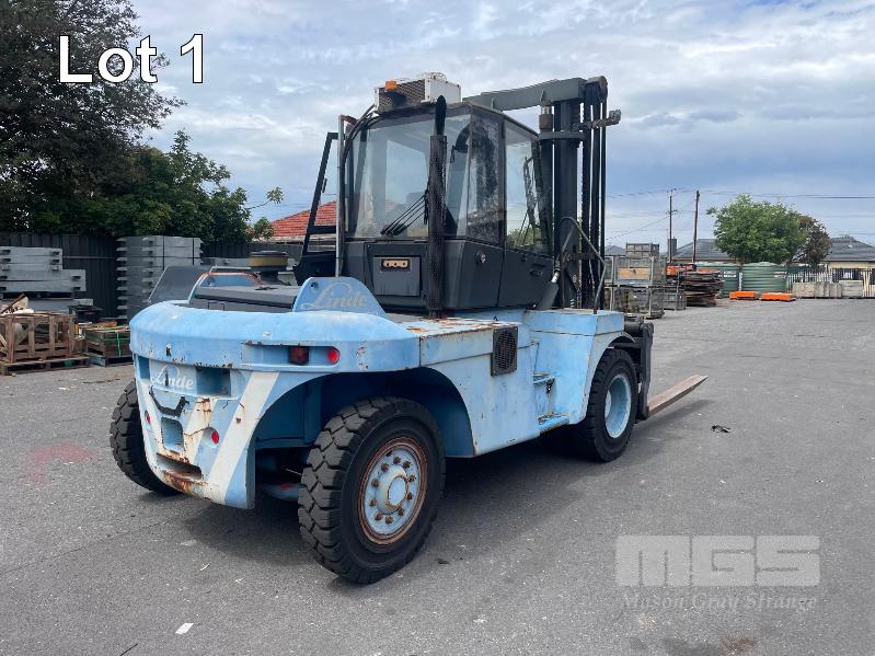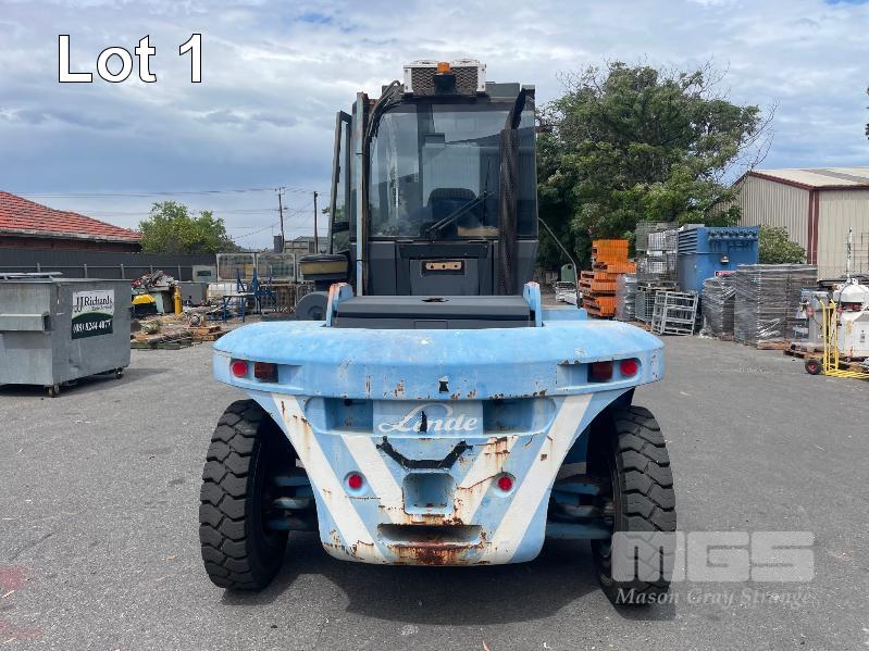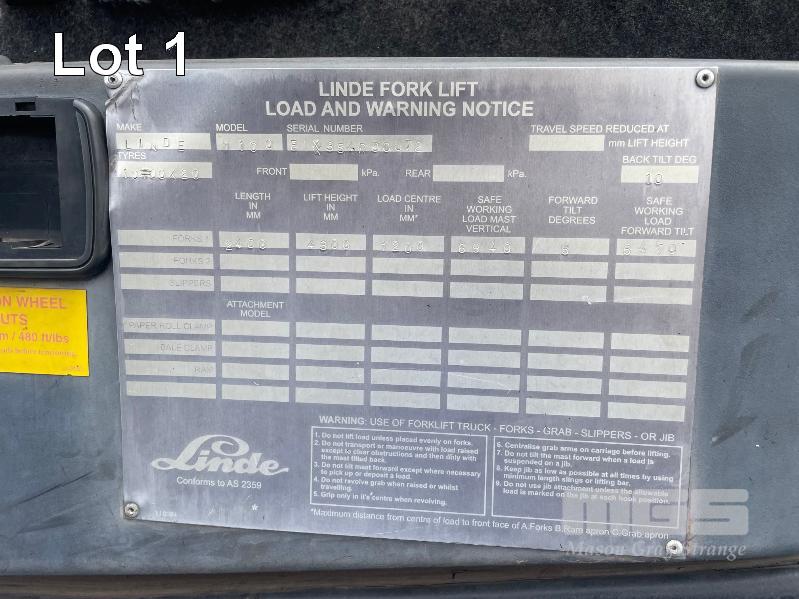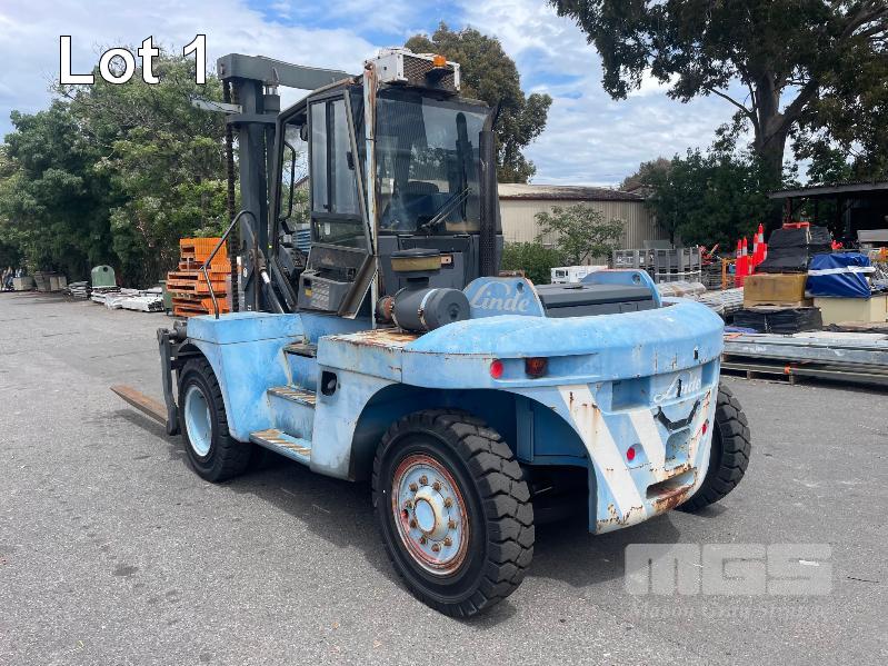 2005 LINDE 10 TONNE FORKLIFT, TYPE: H100, SERIAL: E1X354R00072, JOYSTICK CONTROL, SIDE SHIFT & BLADE POSITION, A/C CABIN, WORK LIGHTS, FRONT & REAR WINDSHIELD WIPERS, PNEUMATIC TYRES IN GREAT CONDITION, AIR BRAKES, TYNE LENGTH: 2450mm, MAST: 3500mm (H) HRS: 1,104 6,940kg CAP WITH BLADE POSITION MODIFICATION, MAX LIFT: 4300mm, 2400mm TYNES, DIESEL KEY #9, DIGITAL CODE START 00850#