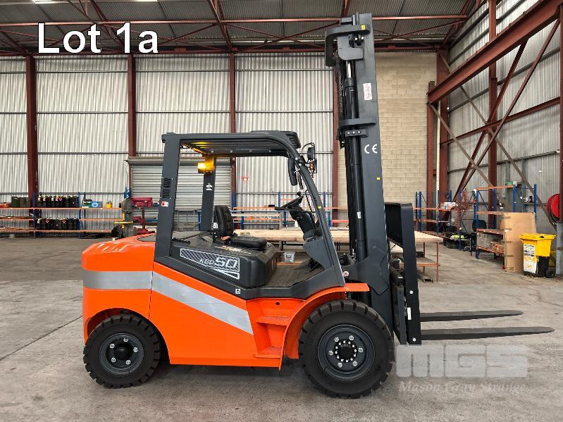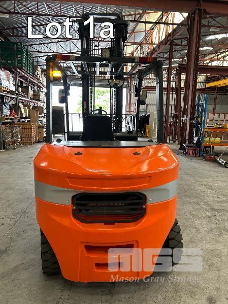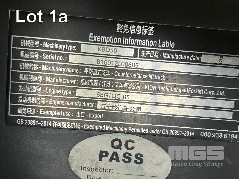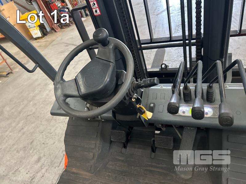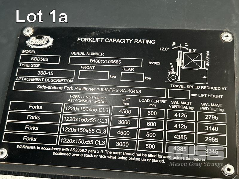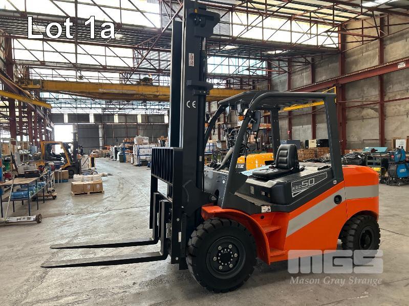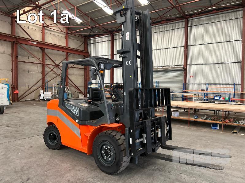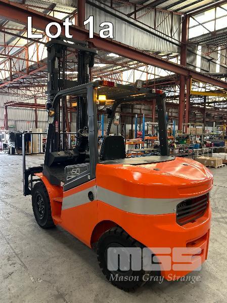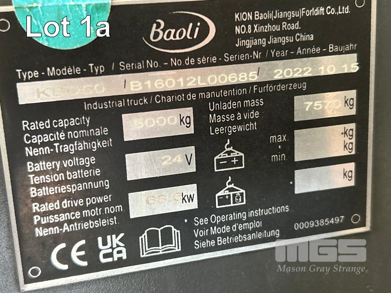2022 BAOLI FORKLIFT, 5T MODEL: KBD50 S/N: B16012LOO685 RATED CAP. 5000kg POWERED BY ISUZU 69kw, 6 CYLINDER DIESEL ENGINE MODEL: GB20891 HRS SHOWING: 73 ONLY FITTED WITH CLEAR VIEW 2 STAGE MAST, TYNE POSITIONING AND SIDE SHIFT, SOLID TYRES, MAX LIFT HEIGHT 4500mm MAX LIFT WEIGHT 4385 @ 500mm LOAD CENTER KEY# 49