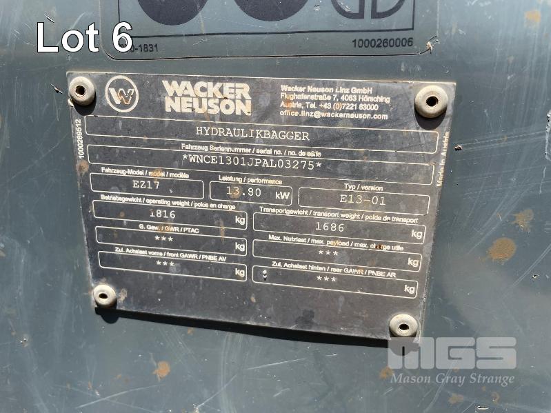 EXCAVATOR, WACKER NEUSON MOD: E217 (CIRCA 2021) VIN: WNCE1301JPAL03275 HOURS: 1,023 ROPS CANOPY, PLUMBED FOR HAMMER, BUCKET SET RUBBER TRACKS
