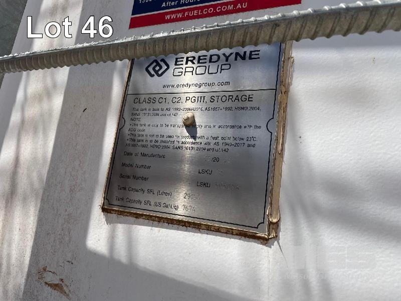 DIESEL FUEL CONTAINERISED TRUCK, 20' EREDYNE GROUP DOM: 2022 MOD: LSKU30 S/NO: LSKU311328-4 CAPACITY: 29,050 LITRE DOB ID SYSTEM TO OPERATE (SMARTFILL) DIGITAL METERED PUMP 240V CONNECTION INCLUDED FOBS & CODED SOFTWARE