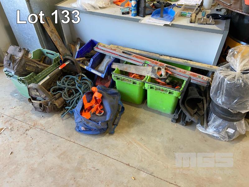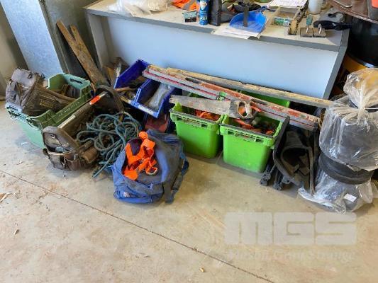 ASSORTED TOOLS,PPE, TOOL BAGS, SAFETY HARNESS, ROPES, LIGHT SAVERS, ETC