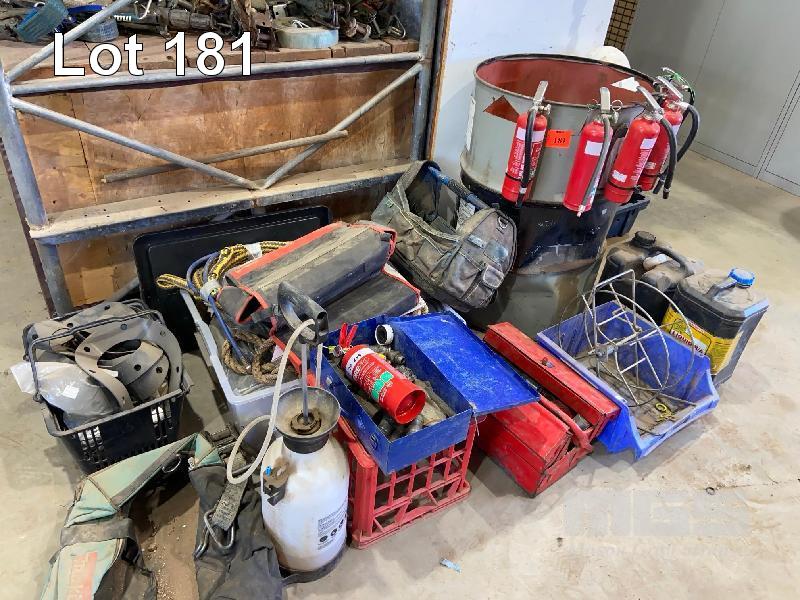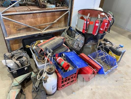 ASSORTED FIRE EXTINGUISHERS, TOLBOXES, TOW ROPE, DRUM OF QUICK RELEASE FITTINGS, ETC