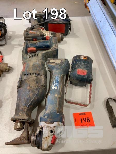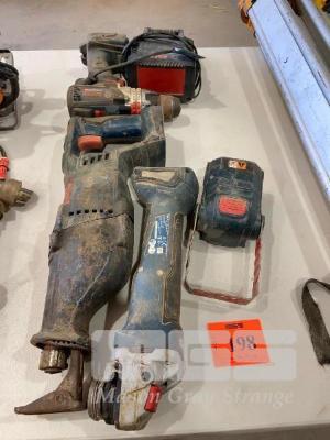 BOSCH CORDLESS TOOLS INCLUDING, GRINDER, RECIPRO SAW, DRILL & CHARGER NO BATTERIES