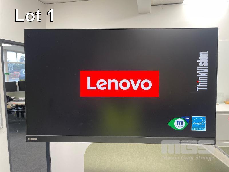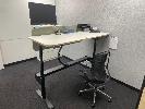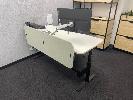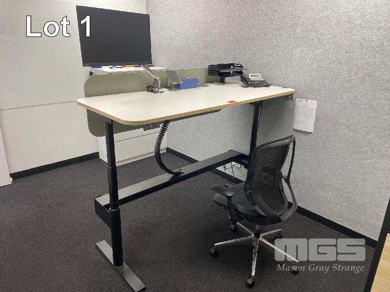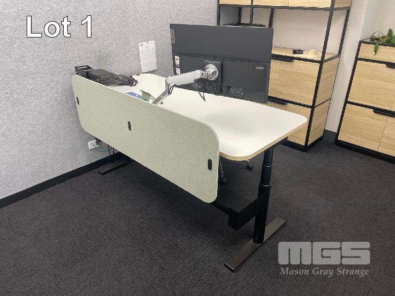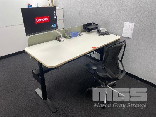 ELECTRIC RISE & FALL DESK, WHITE TIMBER LAMINATE 1800 x 800mm, 240V MAX: 1280mm(H) BLACK STEEL FRAME, LOCKABLE DRAWER, OKAMURA GAS LIFT CHAIR & LENOVO 27" MONITOR