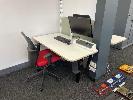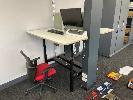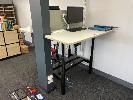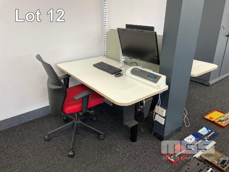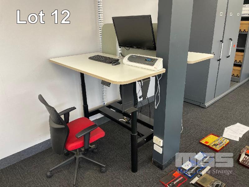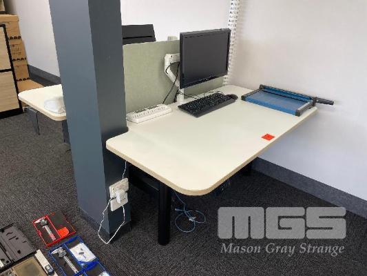 ELECTRIC RISE & FALL DESK, DOUBLE SIDED, WHITE TIMBER LAMINATE 1400 x 750mm, 240V BLACK STEEL FRAME MAX: 1280mm (H) ASUS 22" MONITOR, PHILLIPS 24" MONITOR & BLIZZARD A3 LAMINATOR 1 x GAS LIFT CHAIR