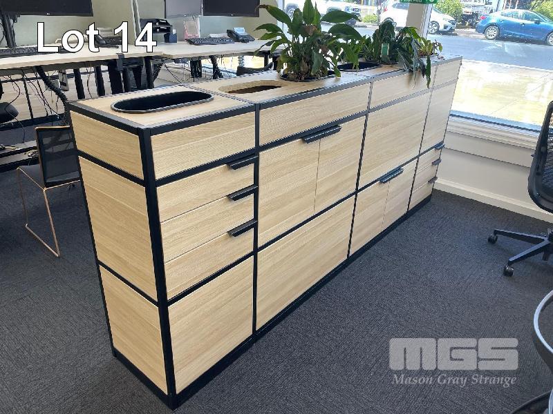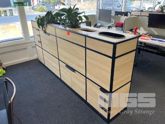 BLACK STEEL FRAME STORAGE UNIT, DOUBLE SIDED 2730 x 450 x 1200mm (H), 12 DRAWER, 8 DOOR, WOOD GRAIN LAMINATE