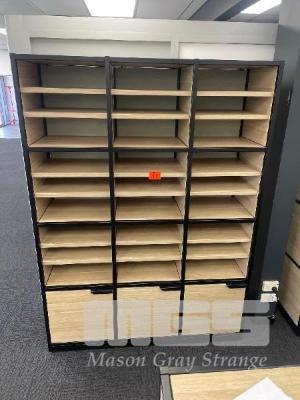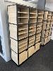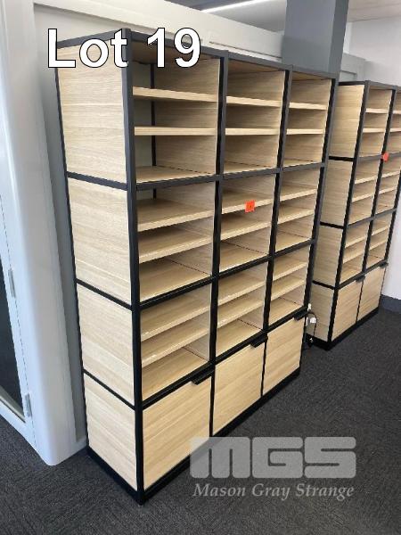 BLACK STEEL FRAME FILE STORAGE SHELVING UNIT, 1450 x 430 x 2000mm (H), 3 BAY, 3 DOOR, 9 TIER WOOD GRAIN TIMBER LAMINATE