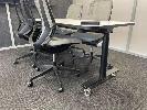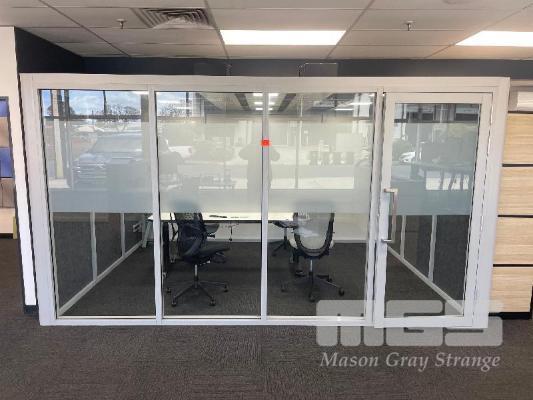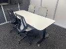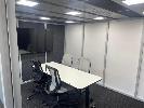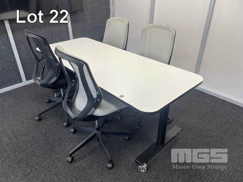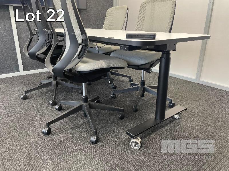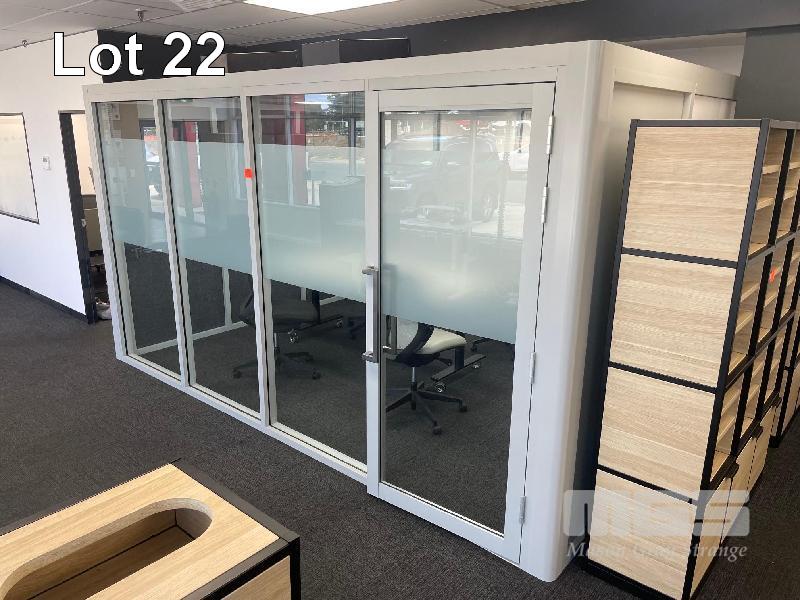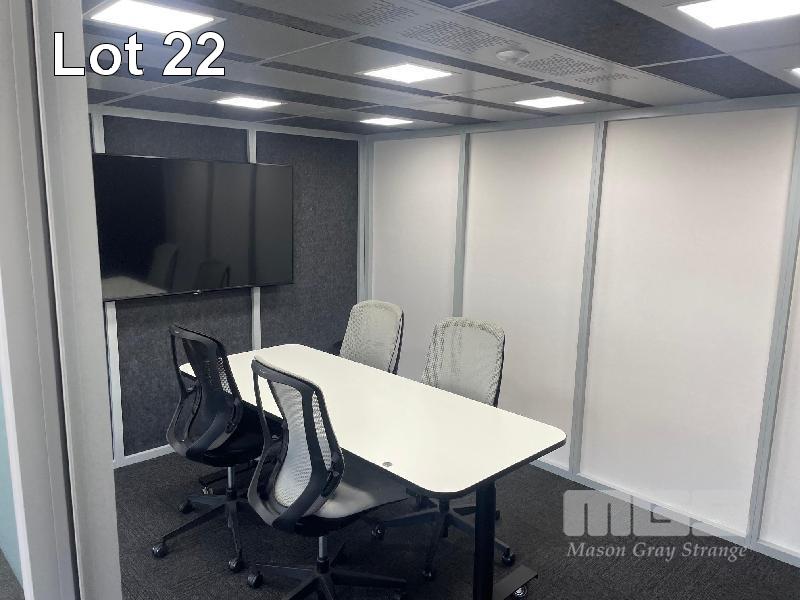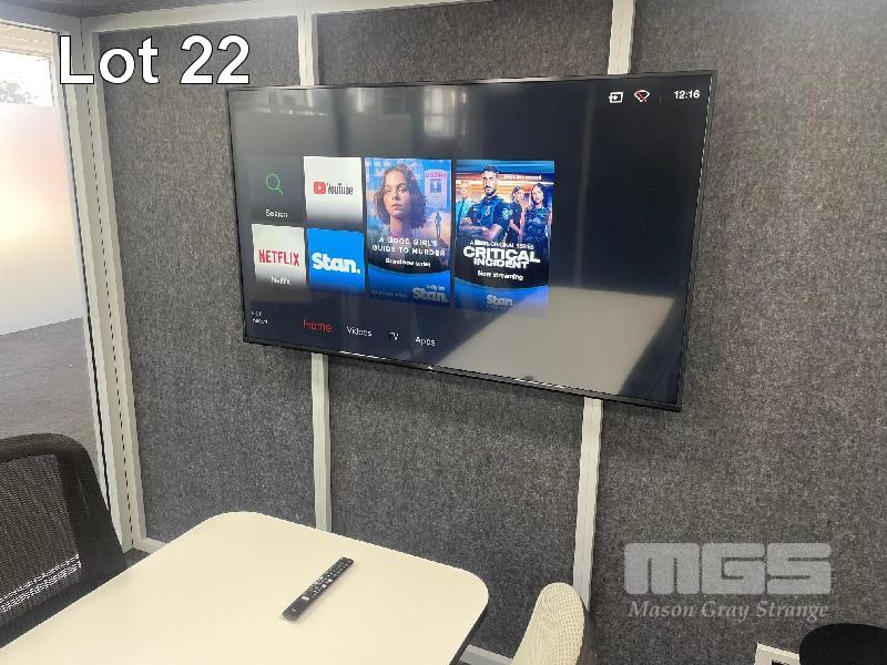 OFFICE POD, FREESTANDING, ALLOY FRAME, SINGLE DOOR, 3 x WINDOWS, 4200 x 3100 x 2230mm LED LIGHTING, 240V AIR RETICULATION, ELECTRIC RISE & FALL MEETING TABLE, 2000 x 800mm WITH 2 x TiMOTION TBB9 BATTERIES WHITE TIMBER LAMINATE, 4 x GAS LIFT CHAIRS, FFALCON 65" SMART TV WITH REMOTE (BUYER TO DISMANTLE)