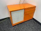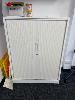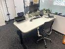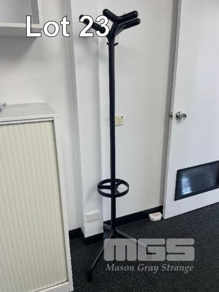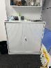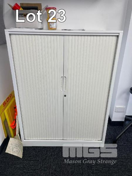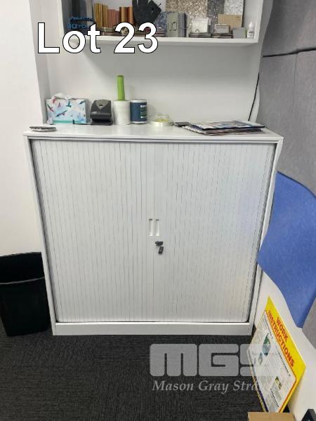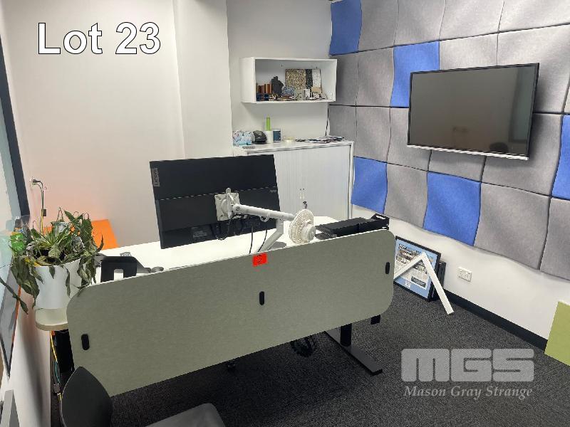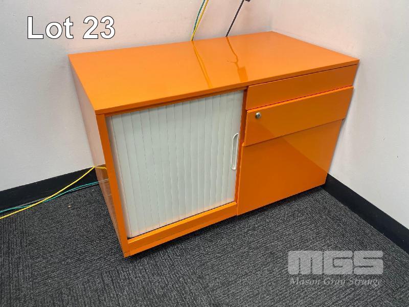 CONTENTS OF OFFICE INCLUDING ELECTRIC RISE & FALL DESK, WHITE TIMBER LAMINATE 1800 x 800mm, 240V BLACK STEEL FRAME GAS LIFT CHAIR, LENOVO 27" MONITOR, 2 x WHITE TAMBOUR CABINETS, 900 x 480 x 1200mm (H) & 1200 x 480 x 1200mm (H), ORANGE TAMBOUR CABINET WITH 3 x DRAWER, 900 x 500 x 600mm, KOGAN 42" TV WITH REMOTE & COAT RACK