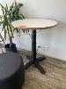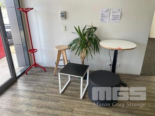 RED COAT RACK, 1600mM (H), TIMBER STOOL, SIDE TABLE, STEEL FRAME, 500 x 500mm, BLACK CLOTH OTTOMAN, 600mm (D) & ELECTRIC RISE & FALL MEETING TABLE, 750mm (D)