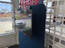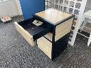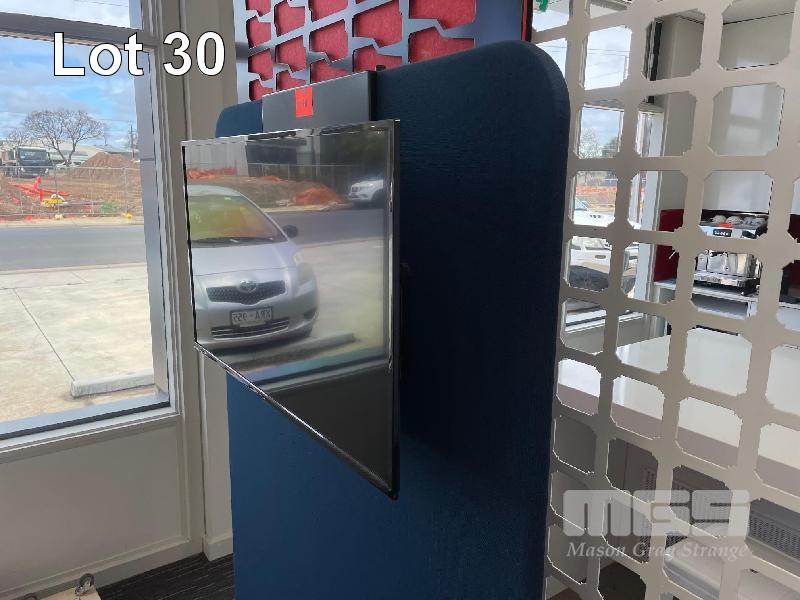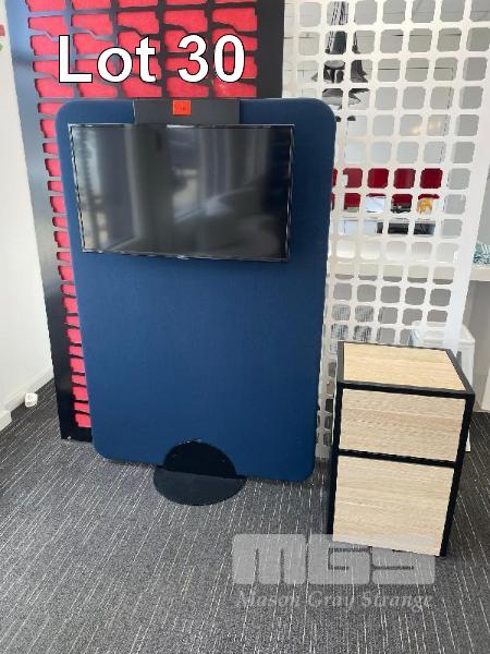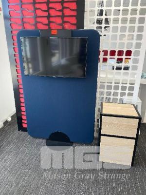 FFALCON 40" SMART TV MOUNTED ON OFFICE PARTITION WITH BLACK STEEL AV CABINET, WOOD GRAIN TIMBER LAMINATE 500 x 450 x 780mm