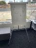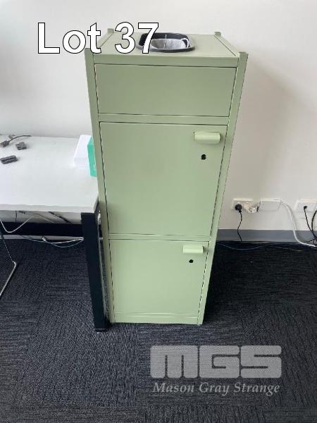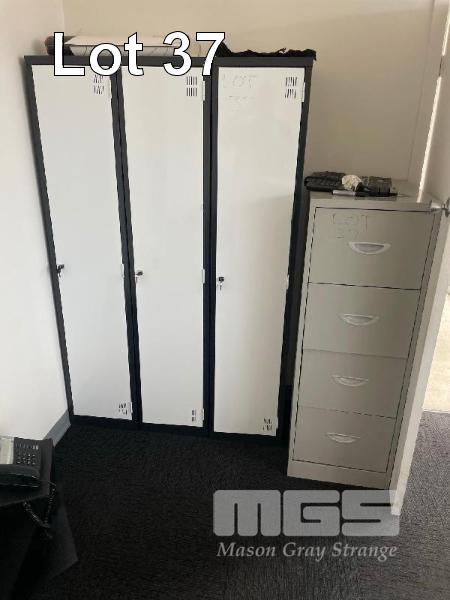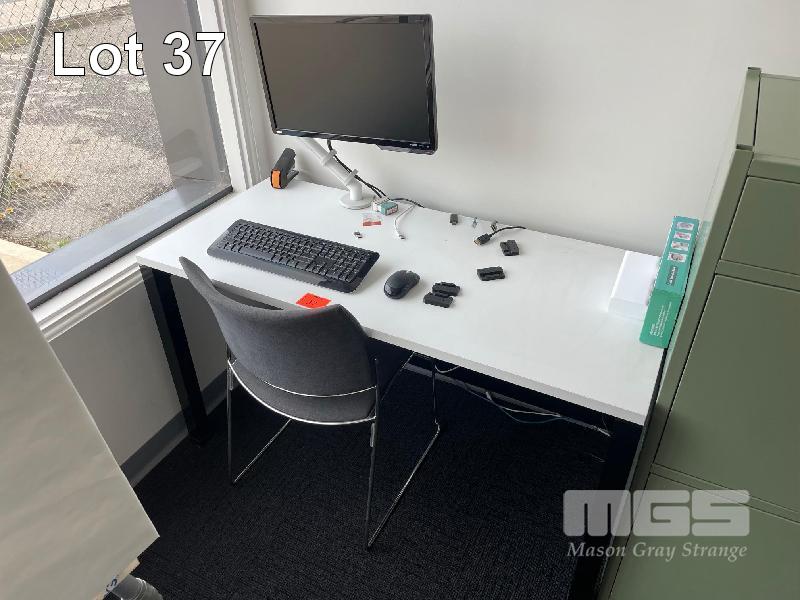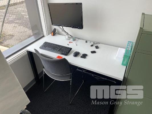 DESK, WHITE LAMINATE 1300 x 600mm, BLACK STEEL FRAME VISITORS CHAIR, BENQ 22" MONITOR 2 DOOR GREEN STEEL STORAGE UNIT, 1200 x 500 x 450mm COLLAPSIBLE ALLOY EASEL, 4 DRAWER FILING CABINET & 3 DOOR STEEL LOCKER SET WITH KEYS, 1800mm