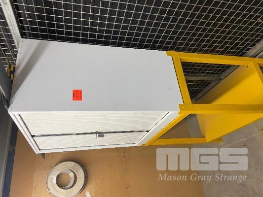 TAMBOUR STOCK CUPBOARD ON YELLOW STAND (LOCKABLE: KEYS PROVIDED) 900 (W) x 450 (D) x 1000mm (H) (NO CONTENT)