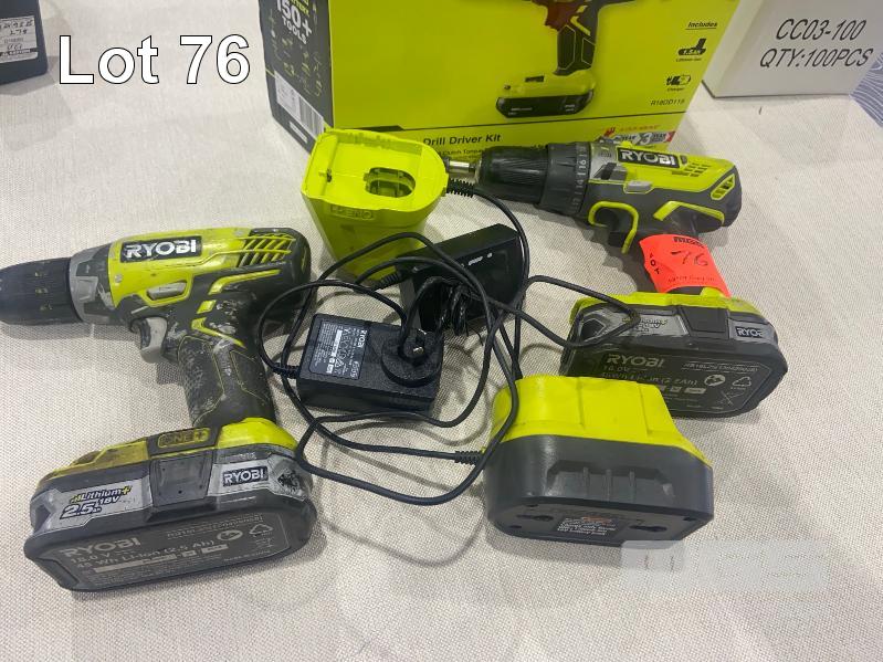 2 x RYOBI CORDLESS DRILLS 1 x BATTERY, 1 x CHARGER