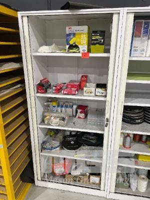 TAMBOUR STOCK CUPBOARD, 2000 (H) x 850 (W) x 450mm (D) & CONTENTS STAPLES, GLUES, FITTINGS, EAR PLUGS, WIPES,