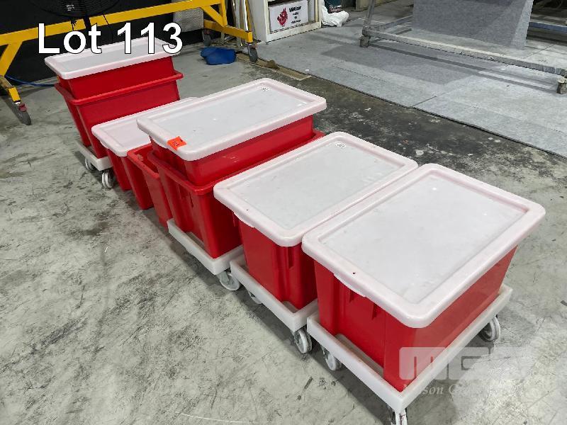 8 x PVC STORAGE TUBS, 5 x LIDS & 4 x CASTOR BASES