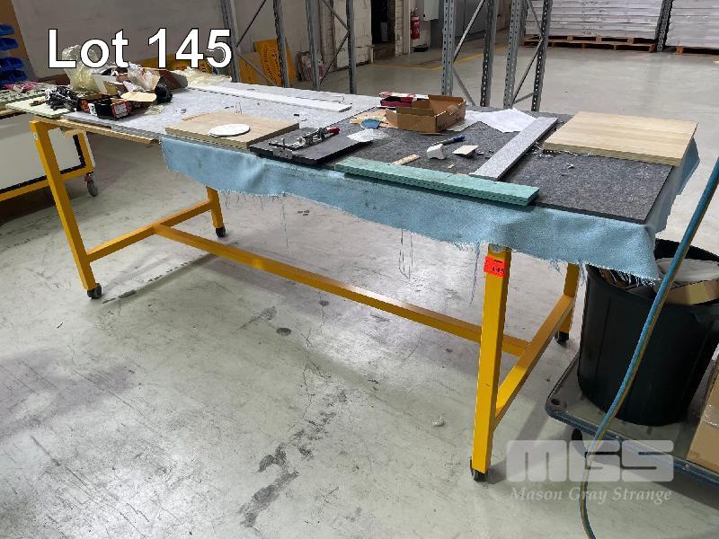 FITTERS MOBILE REPAIR TABLE, 300 x 1000mm LOCKING CASTORS, SMALL STOCK TROLLEY & RISE & FALL ELECTRIC WORK TABLE, LAMINATED TOP, 1200 x 1200mm