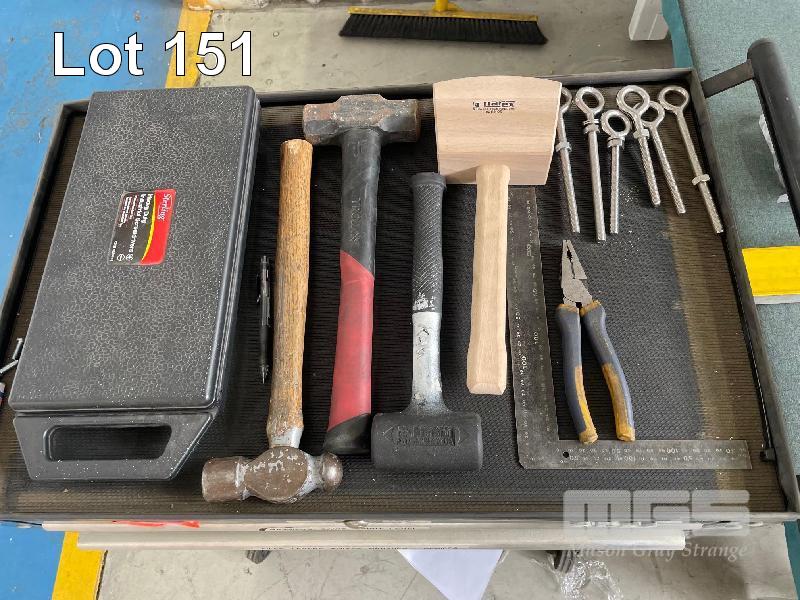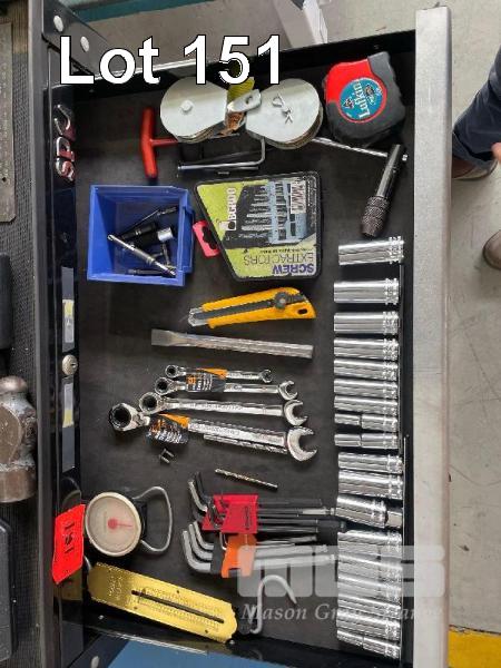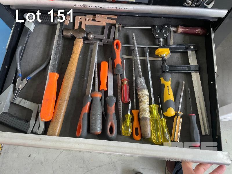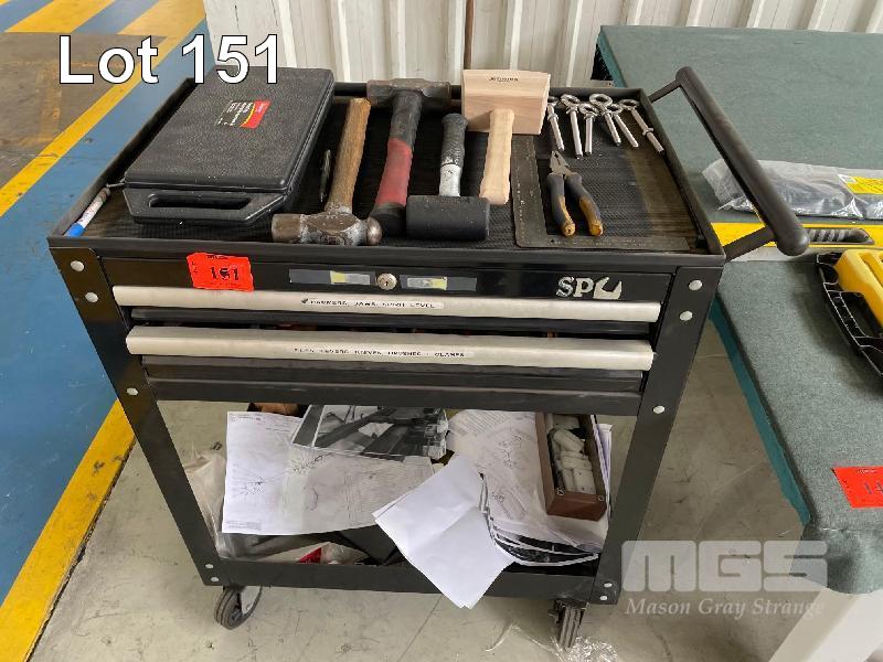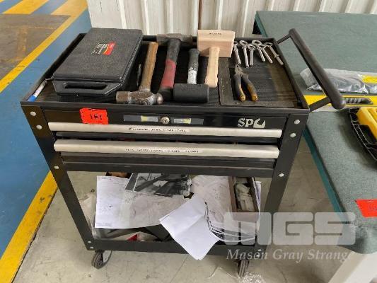 SP TOOLS MOBILE TOOL BOX & CONTENTS HAMMERS, DRIVERS, LONG SOCKETS, HEX KEYS, PACKING TAPE ETC.
