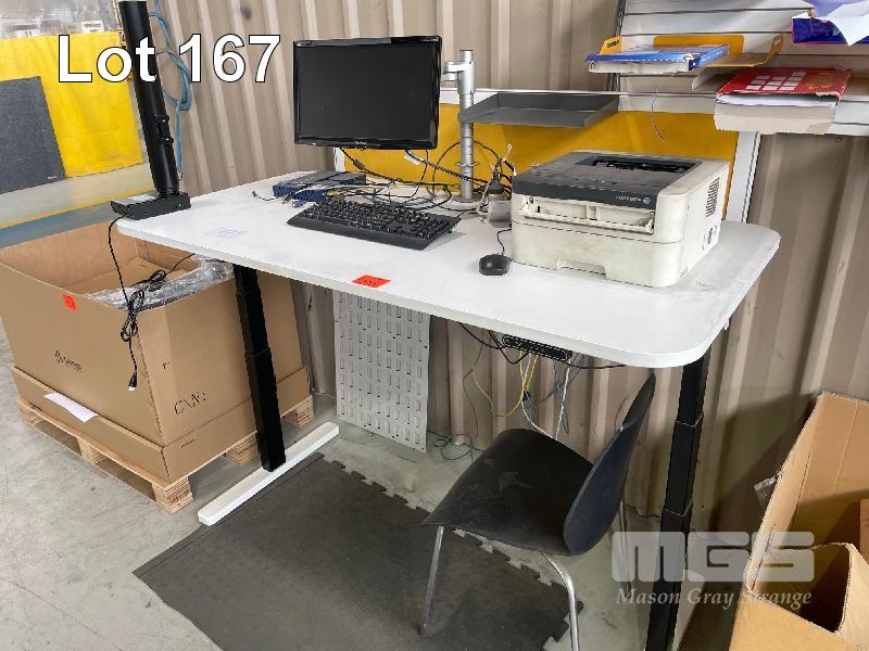 WHITE RISE/FALL TABLE, 1600 x 800mm, KEYBOARD, MONITOR, FUJI PRINTER, CHAIR & PINBOARD