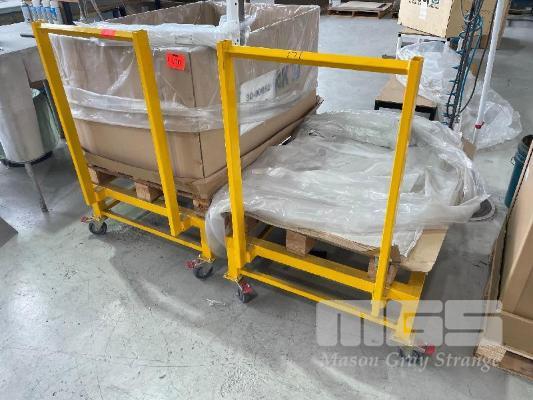 2 x PALLET TROLLEYS, YELLOW, LOCKING CASTORS