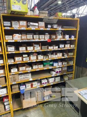 ASSORTED HARDWARE, SCREWS, WASHERS, CUT OFF DISCS, CONTENTS RACK, 8 x SHELVES