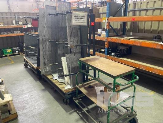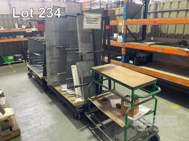 3 x ASSORTED STOCK TROLLEYS, 2 x SINGLE SIDED VERTICAL & 2 TIER HORIZONTAL