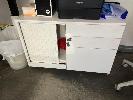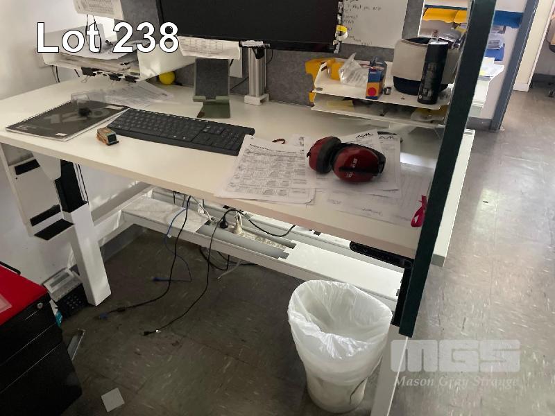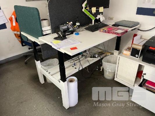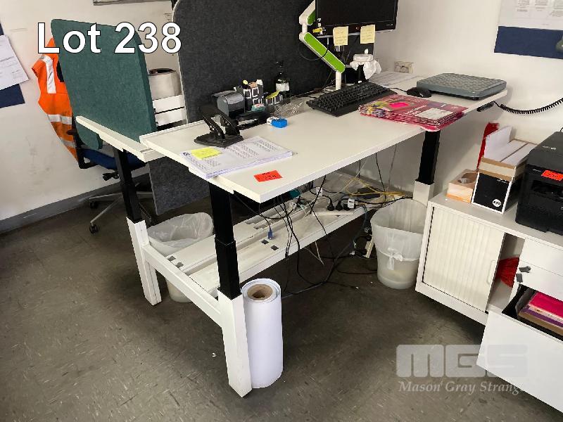 DOUBLE SIDES ELECTRIC RISE & FALL DESK 1500 x 640mm EACH SIDE 2 x MONITORS 2 x KEYBOARDS 2 x GAS LIFT CHAIRS 4 DRAWER STEEL FILING CABINET LOW LINE 3 DRAWER, 1 DOOR, WHITE STEEL STORAGE UNIT