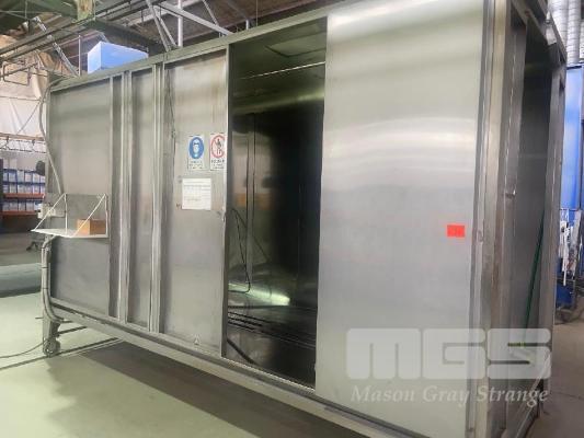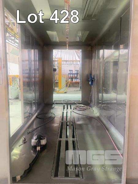 POWDER COAT BOOTH, 4000 (L) x 1900 (D) x 2700mm (H) STAINLESS STEEL TAPERED FLOOR TRAP LIGHTING, PASS THROUGH LINE ACCESS & EXIT, TUBE TO FIRST CONNECTION UNIT IS ON RAILS, 4300mm (L) HEAD MASK AIR LINES & REGULATOR SET CAN BE ADAPTED FOR AUTO SPRAY UNITS