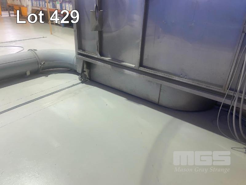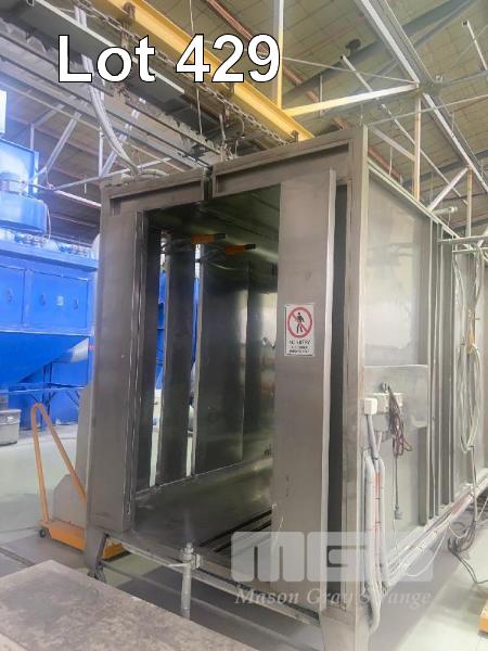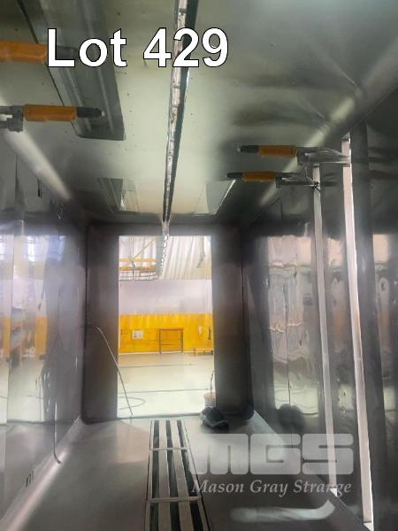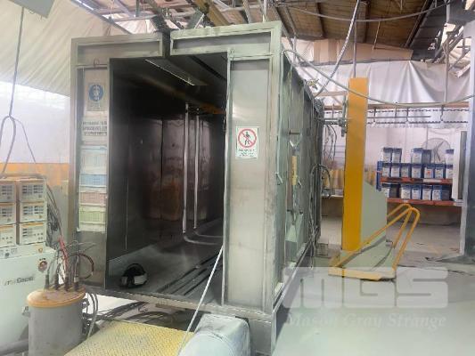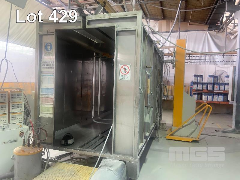 POWDER COAT BOOTH, 4000 (L) x 1900 (D) x 2700mm (H) STAINLESS STEEL SET UP AS AUTO SPRAY UNIT 2 x TW GEMA ZA04-16 RISE/FALL SPRAYS TWIN HEAD WITH GEMA OPTI TRONIC CONTROL 4CG03 2CR04 WITH POWDER BIN CHAIN LINE ACCESS ROLL AWAY PROVISION DISCONNECT AT FIRST JOINT