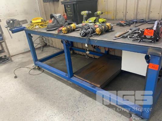 HEAVY DUTY WELDERS BENCH, 2400 x 1200 x 10mm PLATE TOP WITH 6" VICE, MOBILE WITH LOCKING CASTORS
