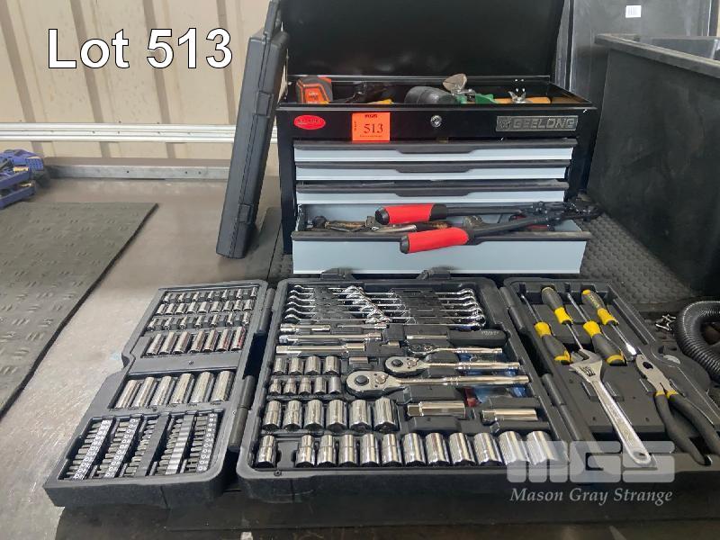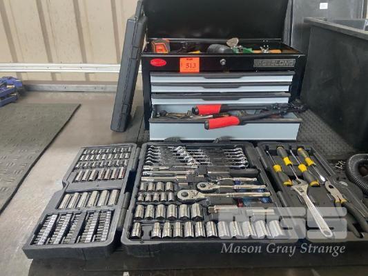 TOOL SET, 4 DRAWER TOOL BOX WITH SNIPS, BOLT CUTTERS, HAMMERS & STANLEY SOCKET & DRIVE KIT