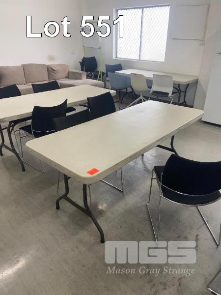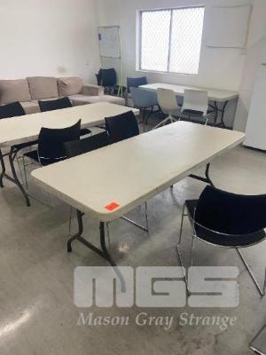 4 x PVC TRESTLE TABLES, 2 x CHROME FRAME TABLES & 18 x MATCHING CHROME FRAME, BLACK FABRIC CHAIRS