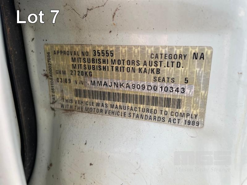2009 MITSUBISHI TRITON GLX ML MY09 DUAL CAB UTE RWD REG: S001ABW (SA) VIN: MMAJNKA909D010343 ODO: 271,202kms SHOWING 3.5L MPFI V6, 5 SPEED MANUAL, PETROL, WHITE DUCO, 4 DOORS, 5 SEAT, RWD AIR CON, SPARE WHEEL (WITH PAPERS, WITH 2 KEY/S, WITH OWNER'S MANUAL, WITH SERVICE BOOKS)