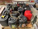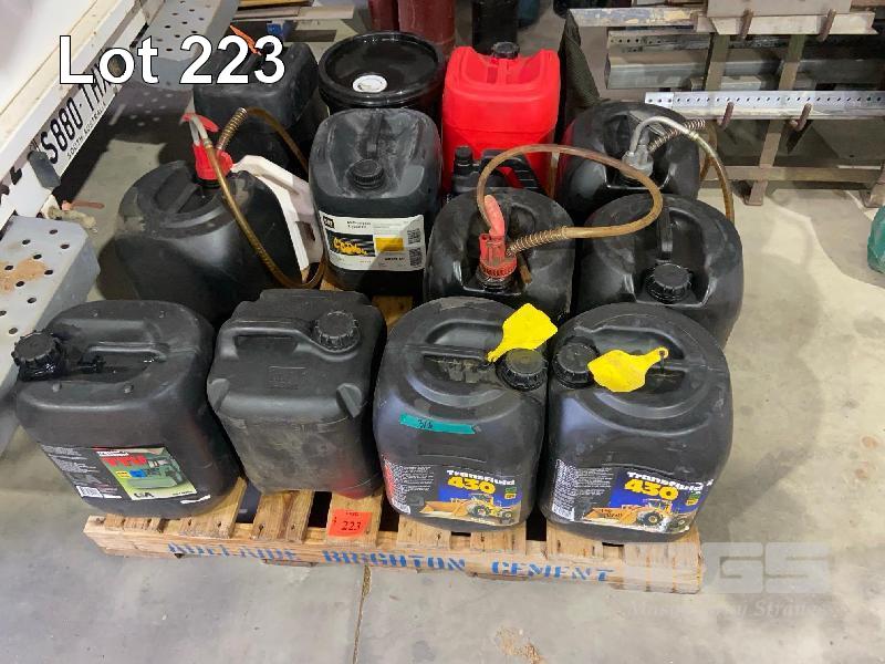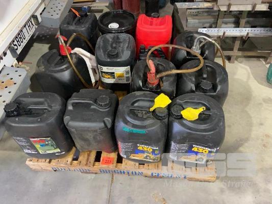 ASSORTED 20 LITRE OIL PUMP/CONTAINERS & ASSORTED AG OILS, ENGINE, FINAL DRIVE, ETC