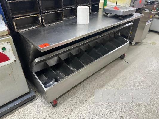 BAKERS PREP BENCH, 2100 x 1200mm, MOBILE WITH 9 COMPARTMENT BULK STORAGE UNDERNEATH