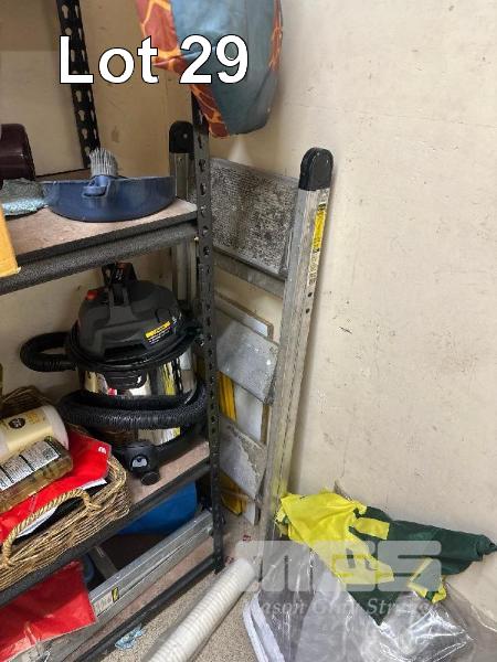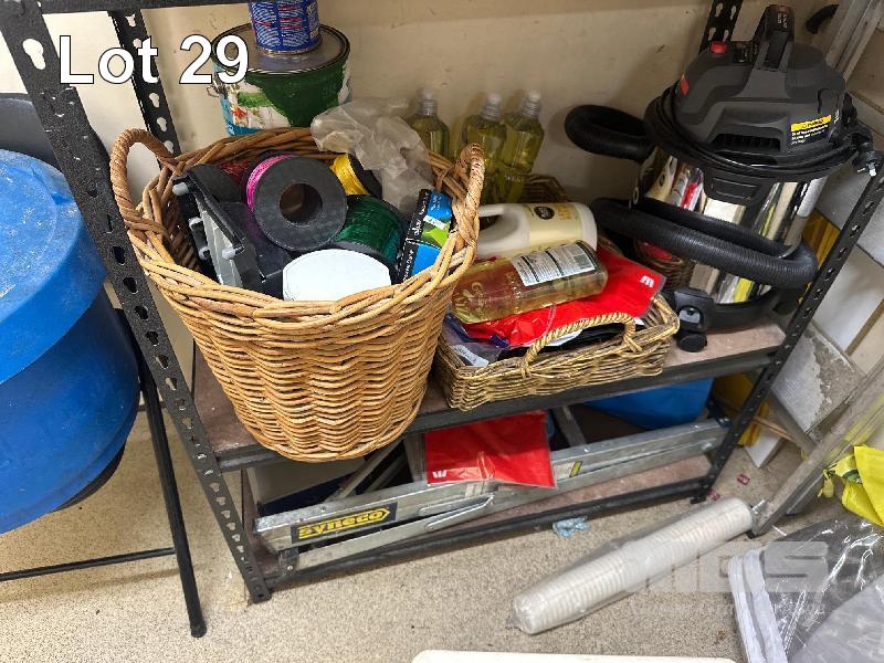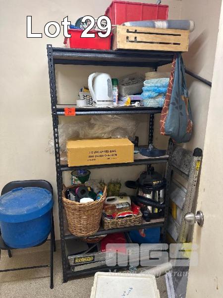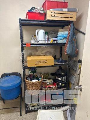 STEEL SHELF UNIT, 1800mm, ADJUSTABLE WITH VACUUM, LADDER, BAGS, CHAIR, ETC.